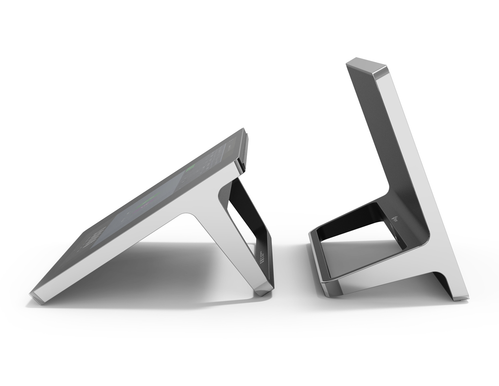 The RealPresence Touch is a desktop video conferencing controller. Interacting with the controller can be conducted from either a seated or standing position. To meet this ergonomic specification, the screen angle appeared to require adjustability. The Big Idea was to provide different screen angles without the use of an adjustable stand.